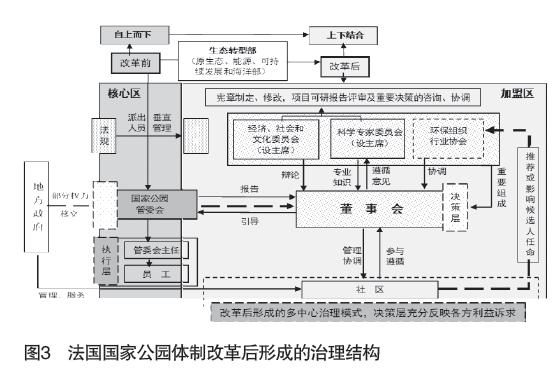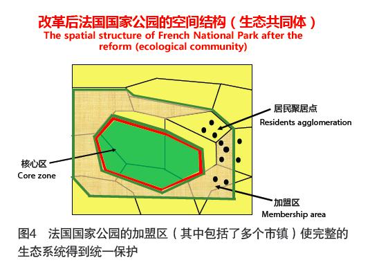 《生态文明体制改革总体方案》明确了中央对部分国家公园直接行使所有权,虎豹公园就可归于其中。但从目前试点工作进展来看, 直接行使所有权的方式还需要针对主要保护对象在人地关系上的特点进行调整。以虎豹公园为代表的试点,人地关系矛盾的解决方案应为公园内人为虎腾地、公园外给人腾地,操作这样的方案需要管理机构有充分的社区信息和较强的统筹能力,而虎豹公园的试点方案和《总体规划》显然未能达到这一要求, 原国家林业局长春专员办的行政资源调配能力也较难实现这样的解决方案。结合同样采用垂直管理模式的法国国家公园改革后“董事会+管委会”的双重决策体系(图3)、加盟区使完整生态系统形成生态共同体(图4)的经验,以及已经明确试点结束后由中央垂直管理的三江源试点区的成功经验,建议探索中央行使所有权的多元共治模式,由吉林省政府的相关厅局、延边州政府和虎豹公园管理局组成管委会,用核心区和加盟区的理念对更完整的生态系统细化分区,在加盟区给予地方政府更多的管理参与权和决策权,尤其在规划、林地权属管理、资金分享等方面的权利,构建更符合虎豹公园人地关系的管理体制。