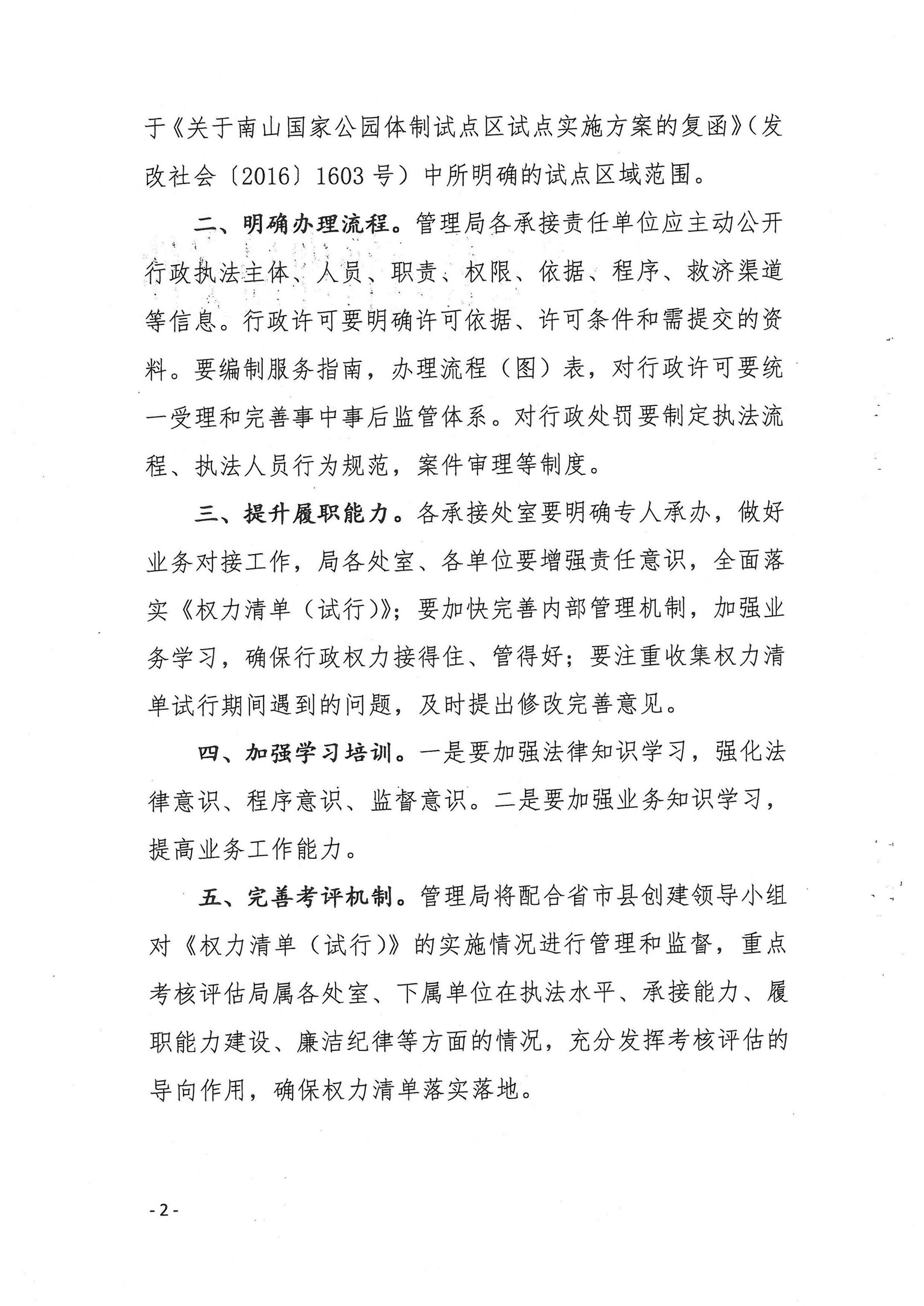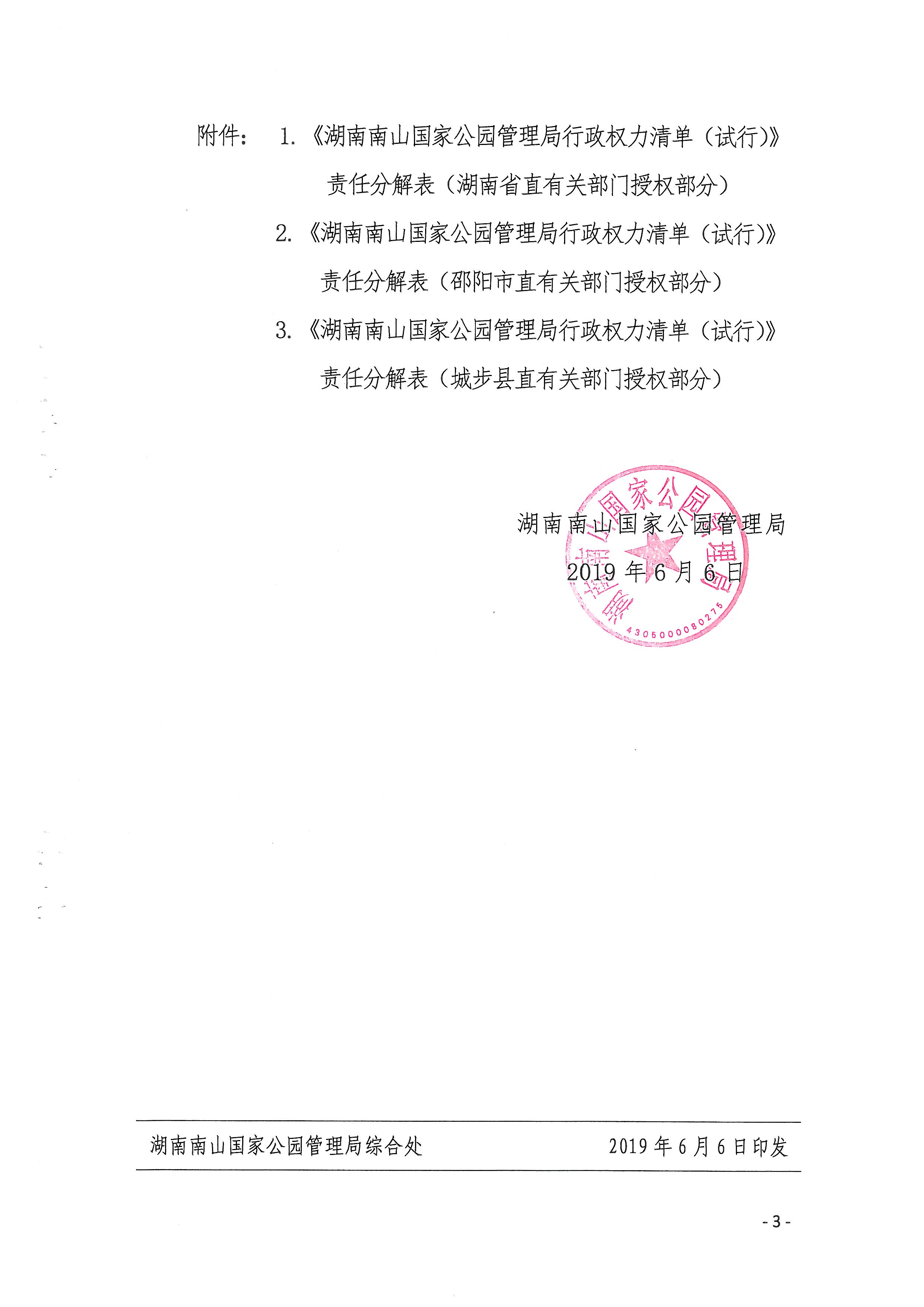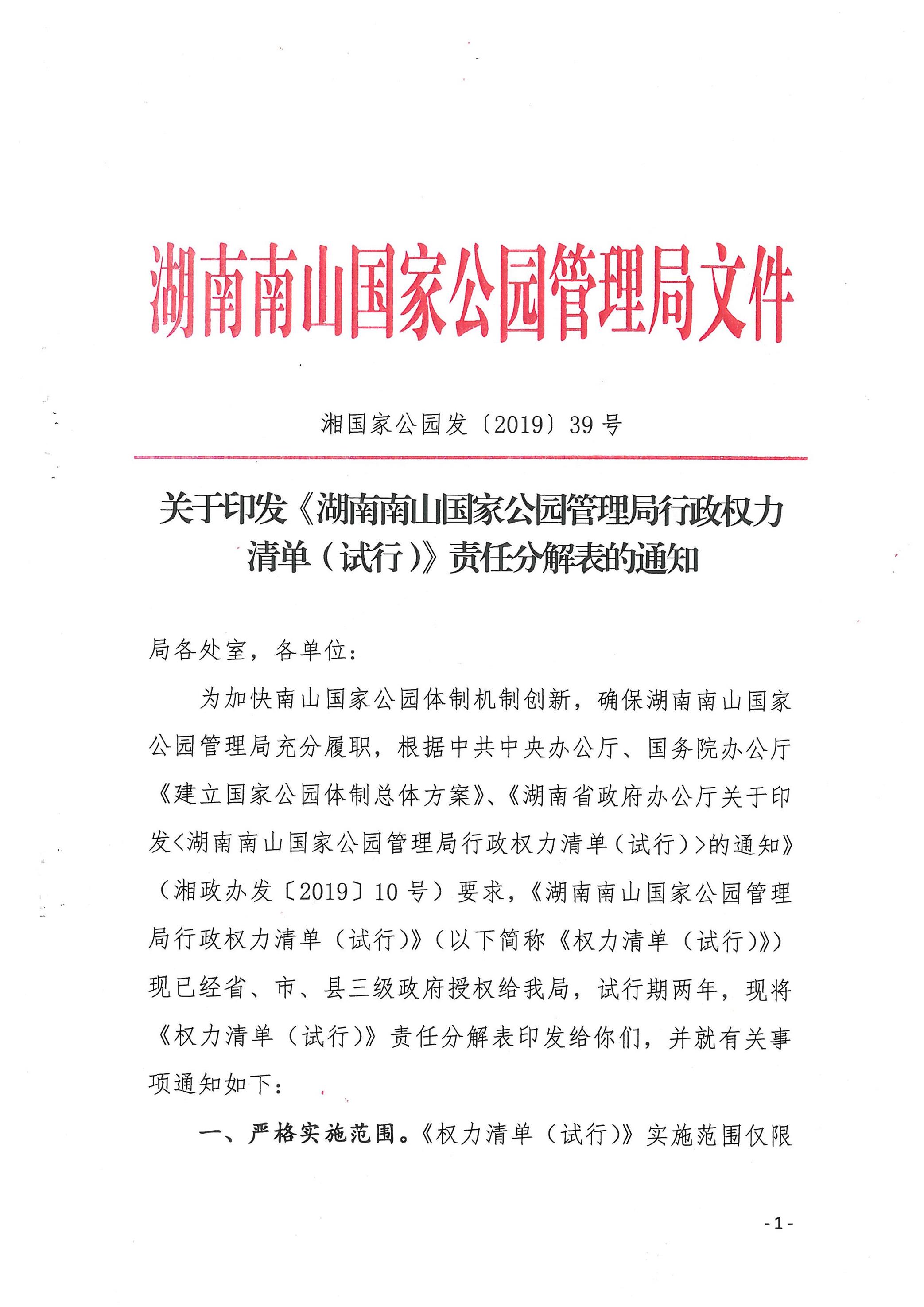 关于印发《湖南南山国家公园管理局权力清单(试行)》责任分解表的通知(湘国家公园发﹝2019﹞39号)