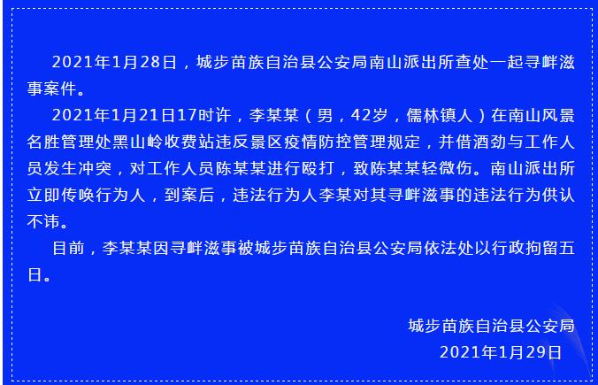 经调查,滋事人李某原系南山居民,现住城步县儒林镇,当天到南山走亲戚。由于在上山途中接受了疫情防控检查等工作,李某心生不满,返回时便借酒撒泼在收费站寻衅滋事。查实后,公安机关依法对李某处以行政拘留五天,罚款1000元的处罚,同时也让当地群众和往来游客受到教育和警醒。