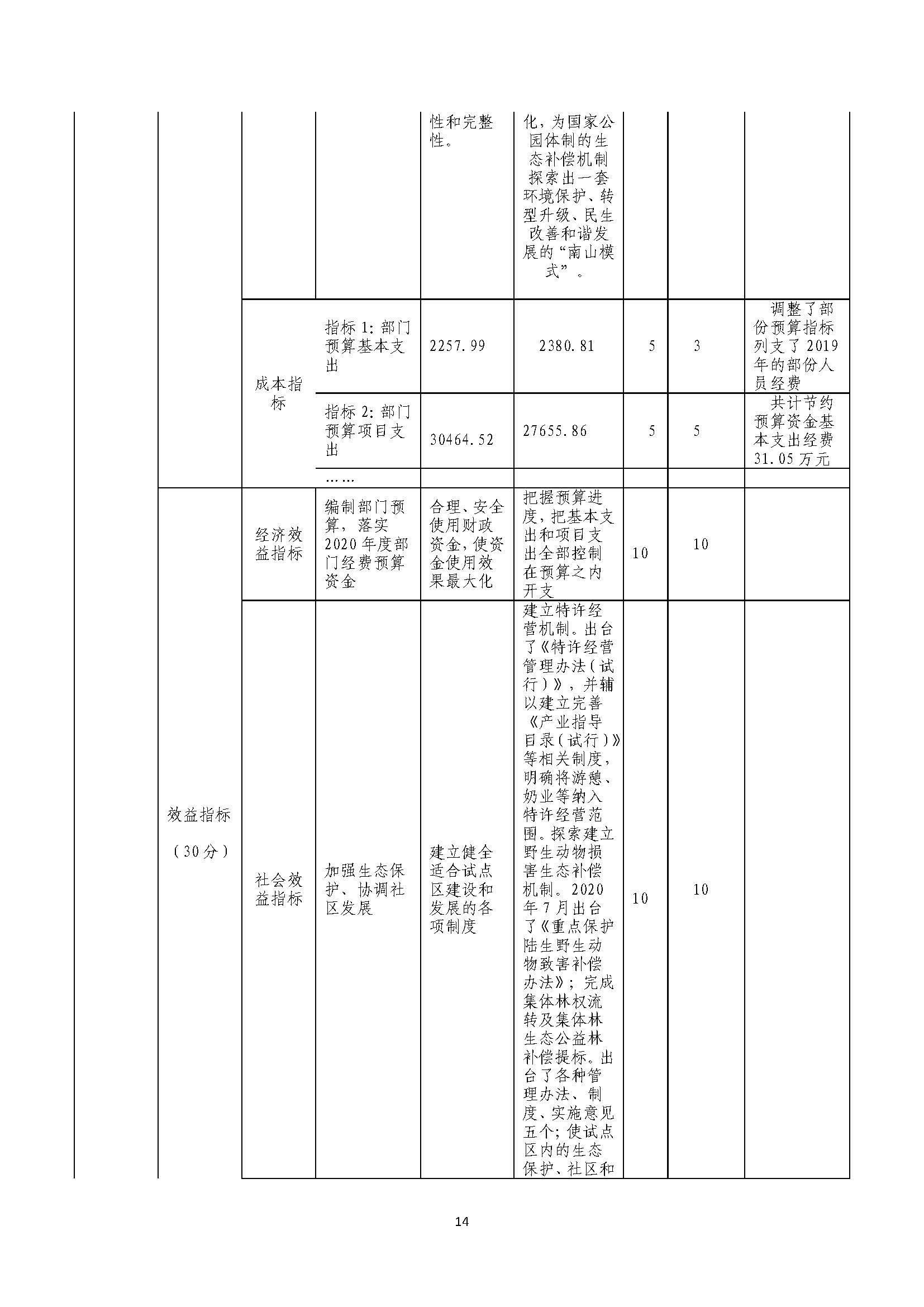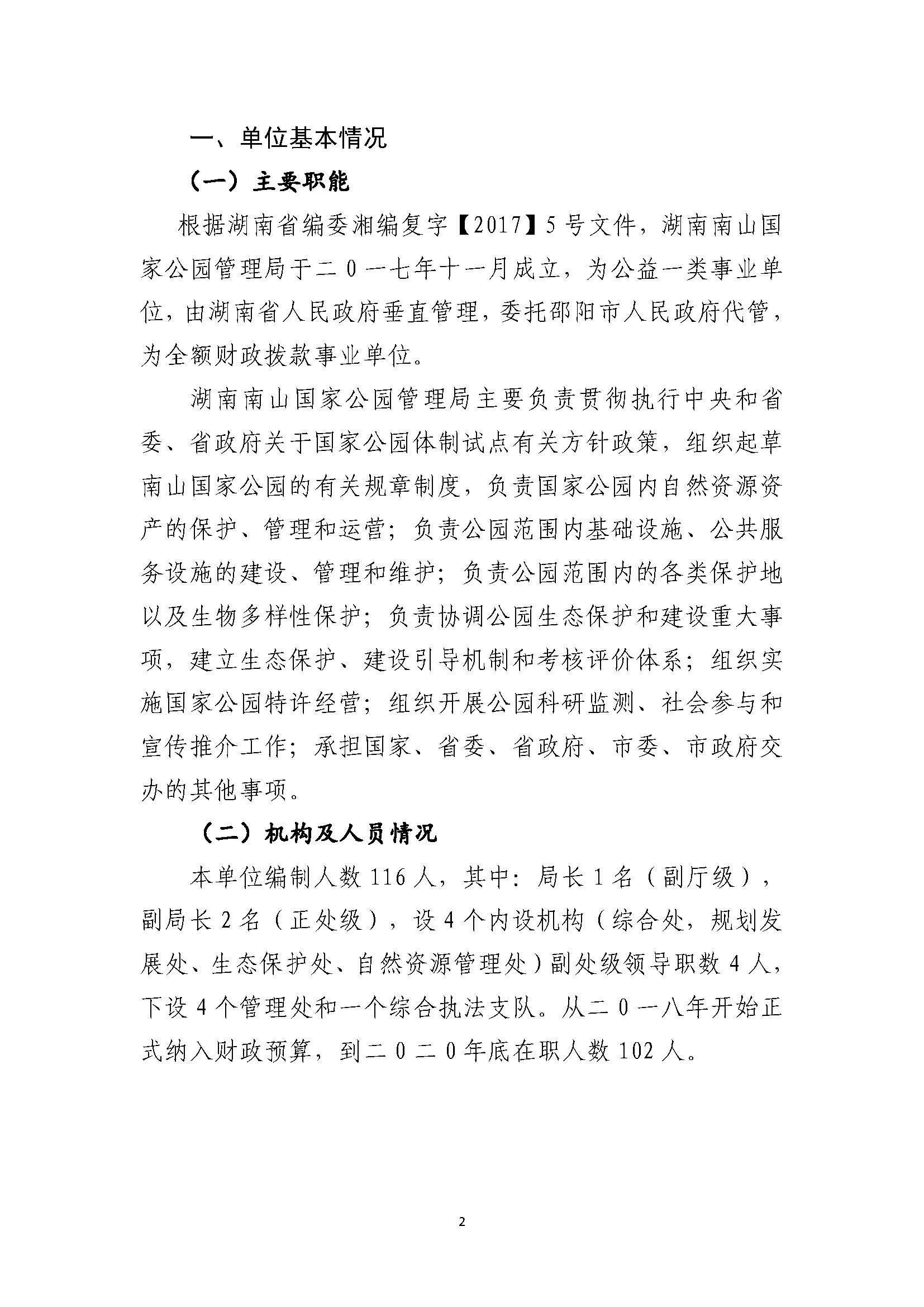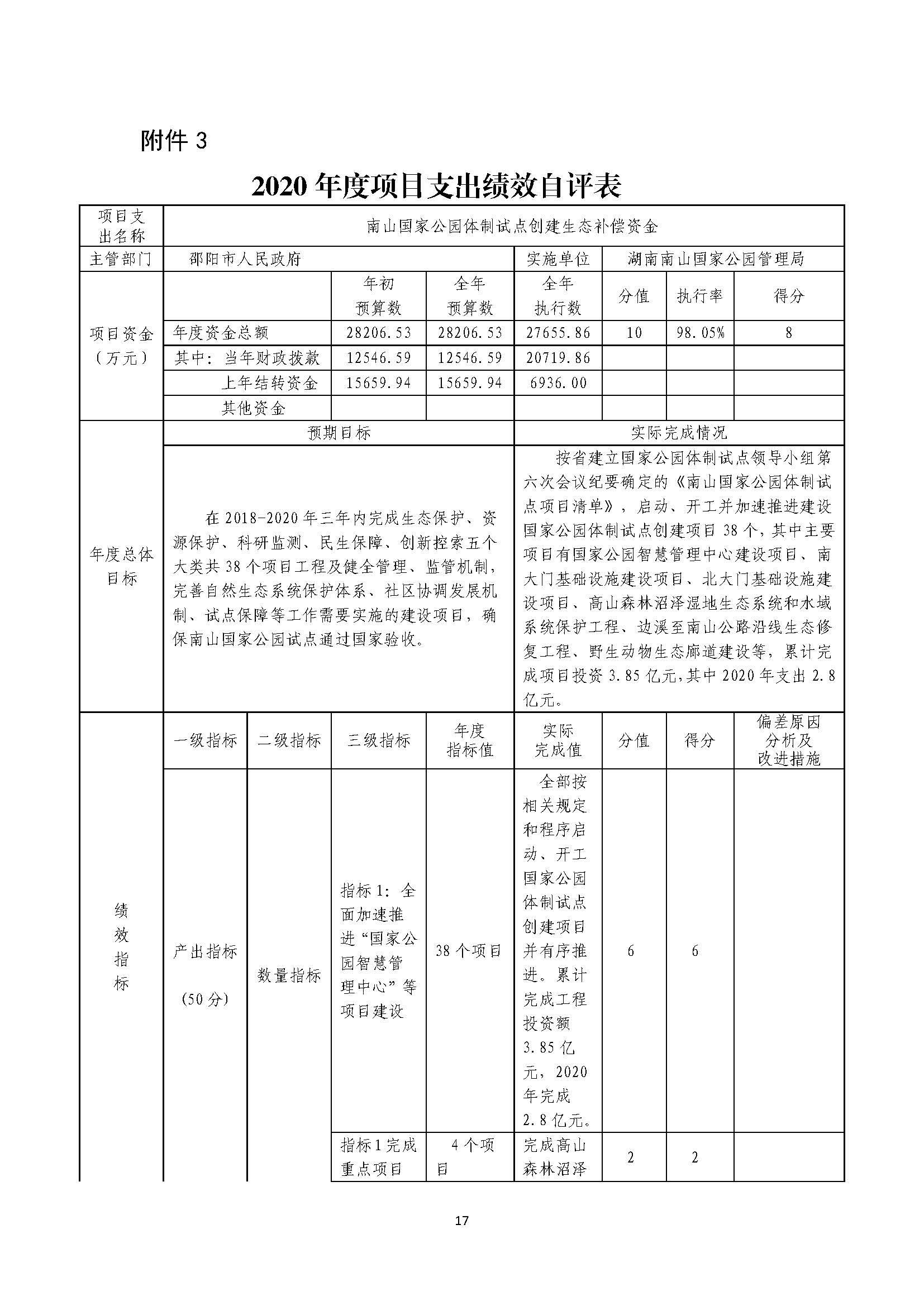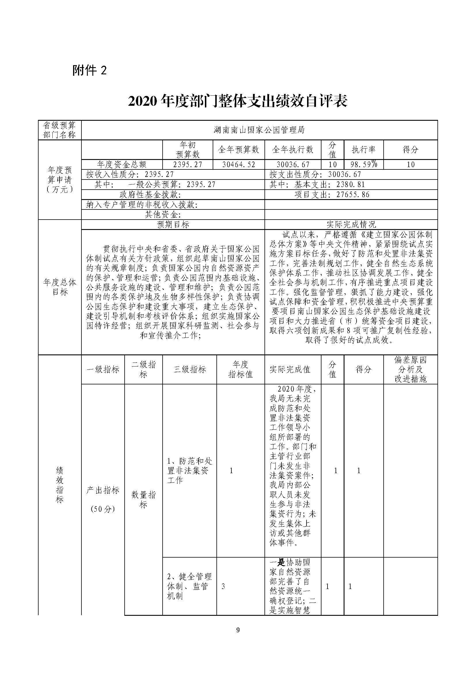 湖南南山国家公园管理局2020年部门整体支出绩效自评报告