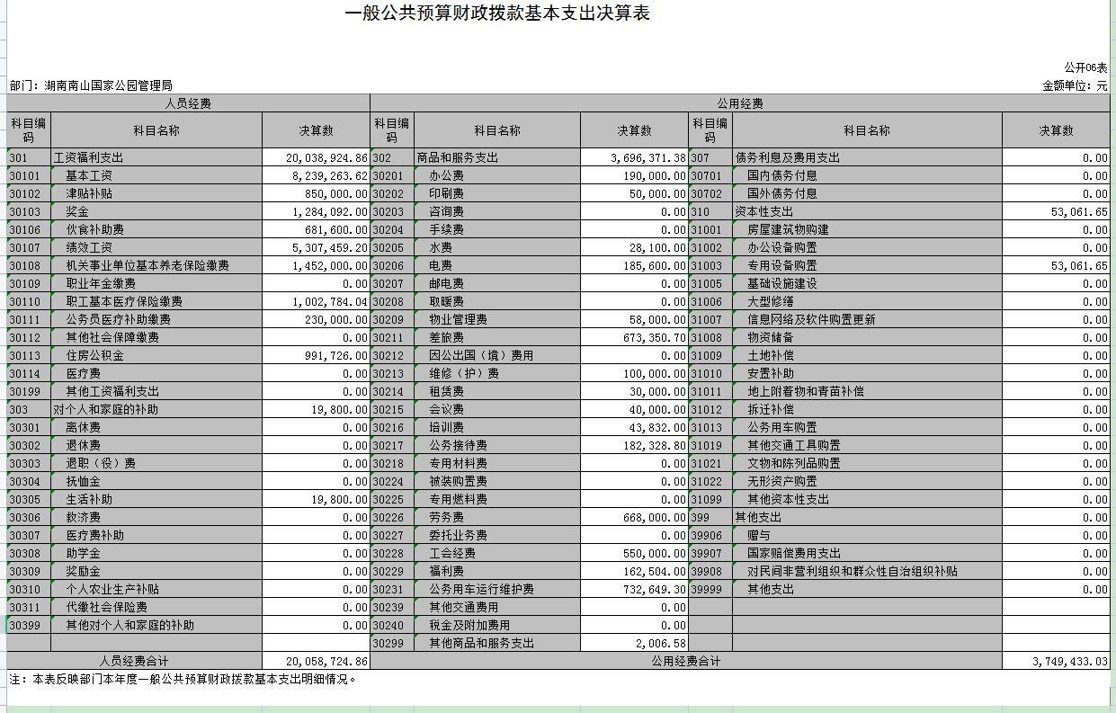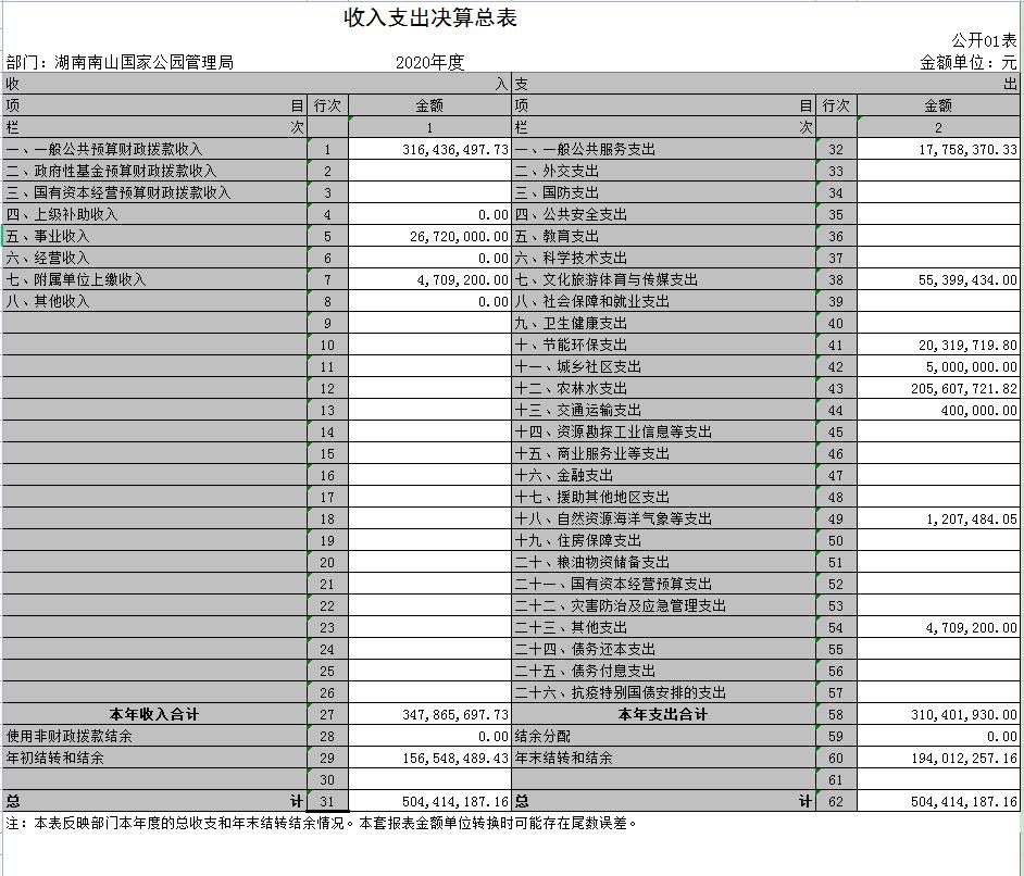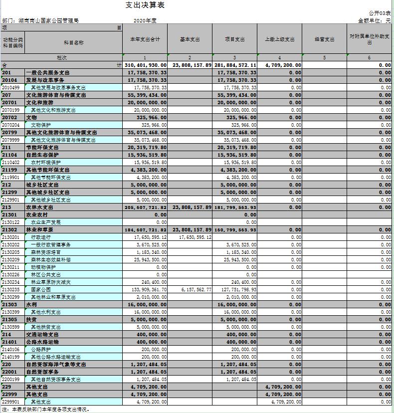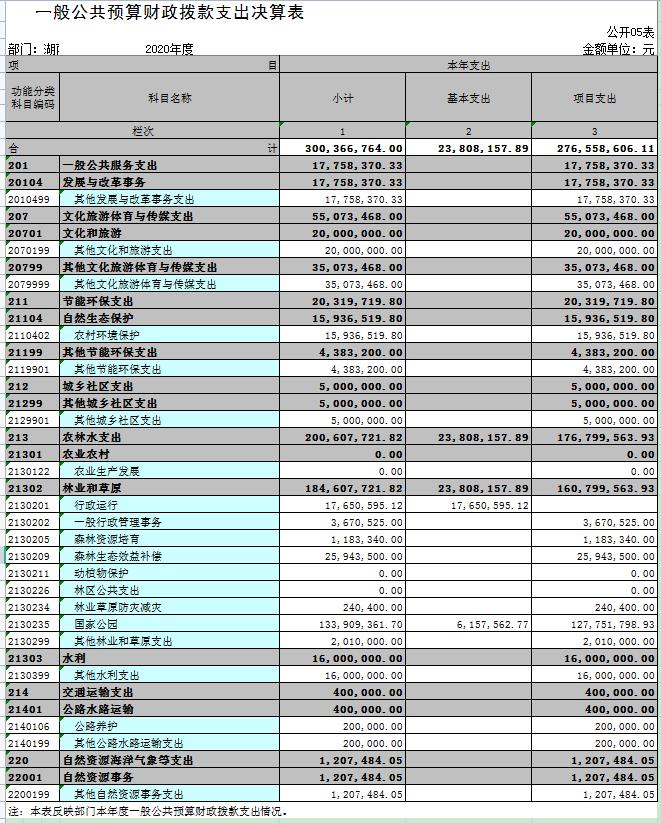2020年决算实际支出为31040.19万元,其中人员经费支出2005.87万元,公用经费支出374.94万元,项目支出28188.46万元,上缴上级支出470.92万元。实际支出同比增加幅度大的主要原因是国家公园创建的主要项目大部份在2020年实施,项目支出预算执行力度大,原来结余的资金全部在当年使用完。