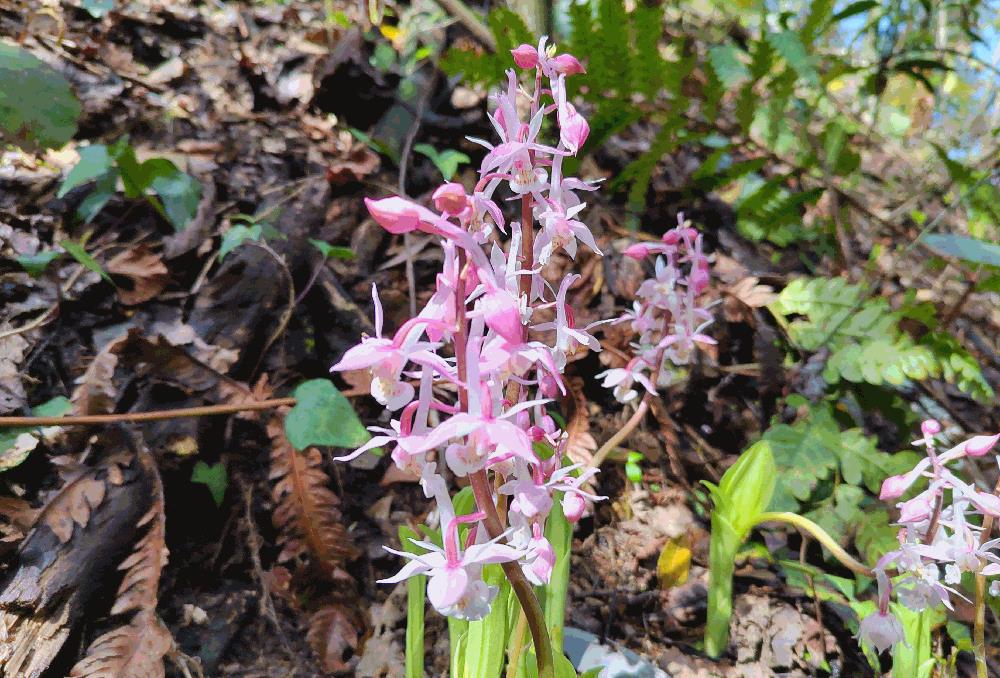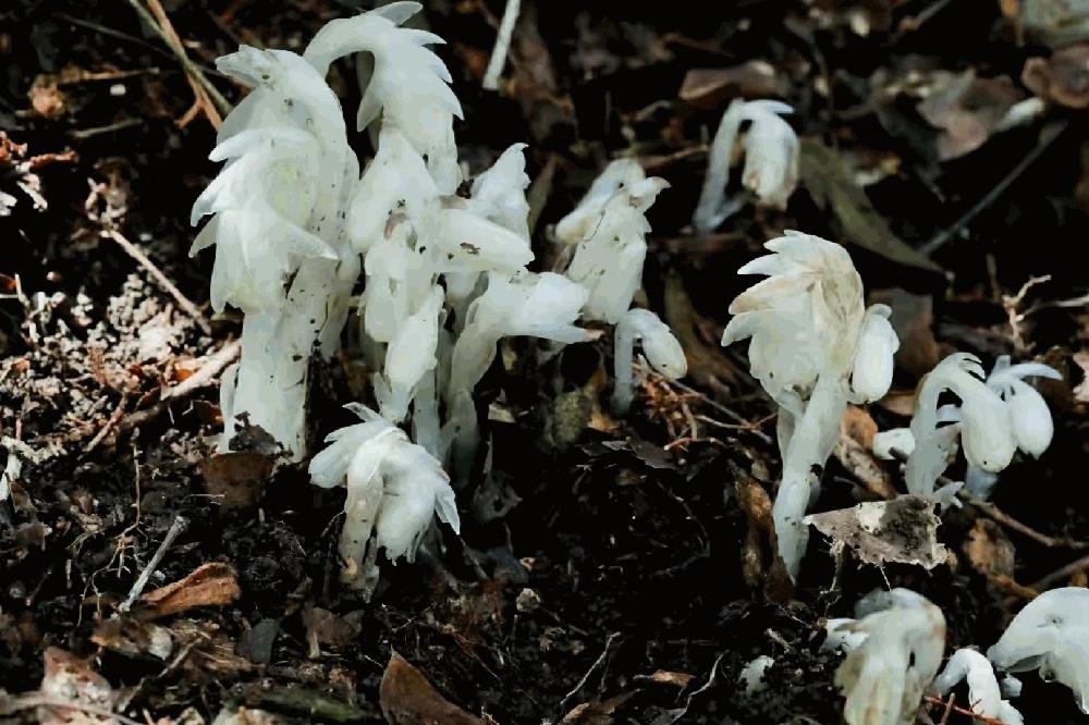 在一处幽暗潮湿的腐叶层上,簇拥生长一种通体洁白如玉的奇特植物,其花筒似烟斗,花朵微下垂,在幽暗处散发出诱人的白色亮光,耀眼夺目。经专家鉴定,这种奇特的植物为有着“花中玉女”之美誉的水晶兰。据资料记载,水晶兰非兰科、蕈类,属鹿蹄草科植物,这种植物非常罕见,它没有叶绿素,不能进行光合作用,仅靠腐烂的植物吸取养分,故又别称“冥界之花”“幽灵之花”。水晶兰对生存环境要求极为苛刻,常生长于海拔800m~3000m阴凉潮湿的针、阔叶混交林间,依靠特殊菌体方能生存,其种子异常微小,在人工条件下难以萌芽。而在另一处腐叶层上,生长着15株鲜花盛放的奇特植物,其花呈下垂状,花色呈白色略带粉红色,花间距松散。经专家鉴定,这种奇特的植物为有着“兰中西施”之美誉的翘距虾脊兰。据资料记载,翘距虾脊兰属兰科虾脊兰属,为半阴生植物,常生长于海拔1000米以上的山地沟谷阴湿处和密林下,喜温暖和湿润环境。