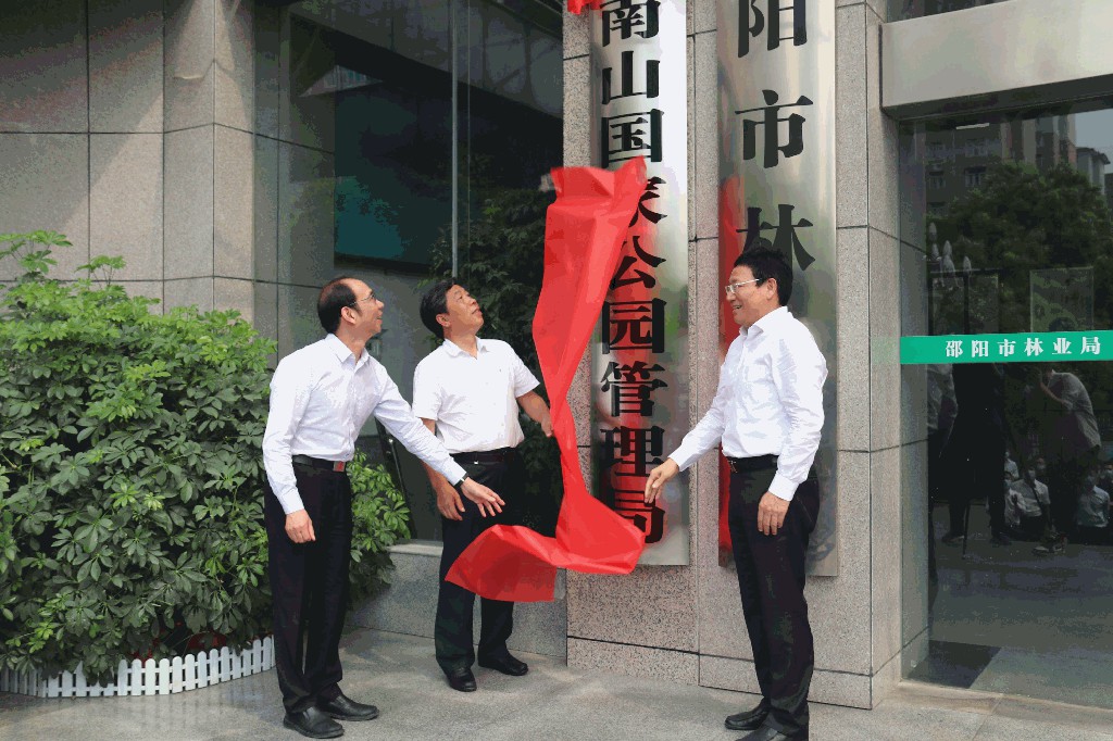 4月12日上午,湖南南山国家公园管理局举行机关整体迁驻邵阳市区揭牌仪式并召开南山国家公园建设座谈会,省林业局党组书记、局长胡长清出席,与邵阳市委书记严华进行了会面交流,并与邵阳市委副书记、市长华学健共同为南山国家公园管理局揭牌。省林业局党组成员、湖南南山国家公园管理局局长王明旭,副市长杨卫平,市政府秘书长陈秋良以及省林业局有关处室负责人、公园管理局班子成员、市林业局负责人参加揭牌仪式与会议;南山国家公园管理局机关全体干部职工,市林业局中层领导以上干部参加揭牌仪式。