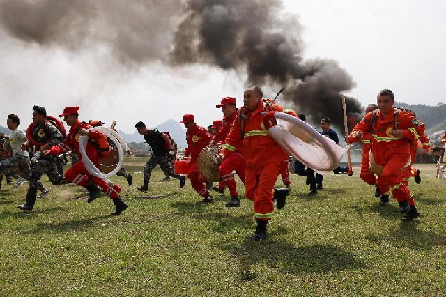 下午,参加演练的8支应急队伍在崀山镇崀笏村蒋家滩进行实地演练,主要考核各队伍消防设备操作能力和体能协作能力。受邀领导、嘉宾进行了现场观摩。