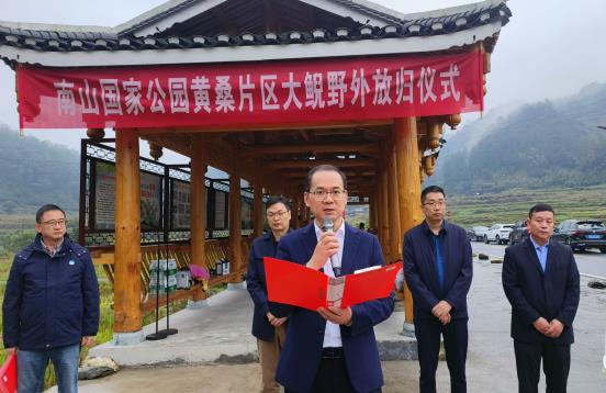 11月9日,南山国家公园黄桑片区大鲵野外放归活动在黄桑国家级自然保护区举行,湖南南山国家公园管理局党委副书记、副局长苏海,湖南张家界大鲵国家级自然保护区事务中心主任魏营,湖南南山国家公园管理局生态保护处处长刘志勇,绥宁县副县长黄文勇,黄桑国家级自然保护区书记袁光平出席仪式并讲话。