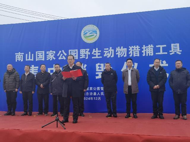 12月10日下午,南山国家公园管理局在智慧管理中心举行野生动物禁猎工具集中销毁仪式。南山国家公园管理局党委副书记、副局长苏海、城步苗族自治县人民政府副县长杨辉刚出席并讲话,湖南南山国家公园管理局机关处室和直属单位负责人以及城步相关职能单位主要负责人等参加。