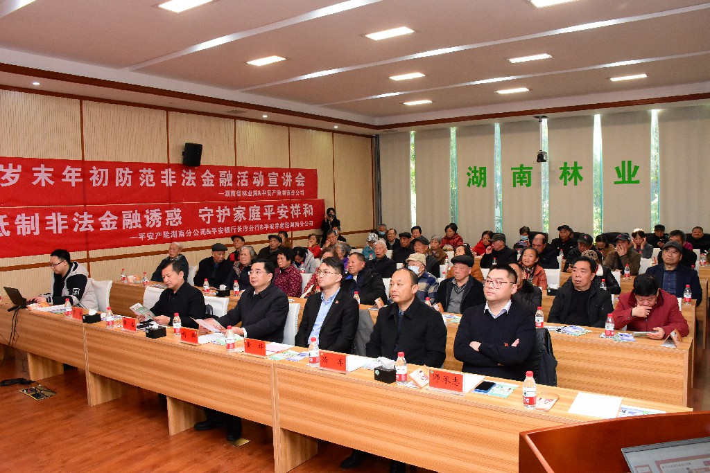随着岁末年初的到来,各类金融活动频繁,为切实提高在职和离退休职工对非法金融活动的防范意识和识别能力,1月17日,省林业局举办了岁末年初防范非法金融集资专题宣传活动。省林业局党组成员、副局长胡锋,平安产险湖南分公司副总经理黄桦出席并讲话,省林业局基金站、离退处负责人和局机关200余名离退休老同志参加。