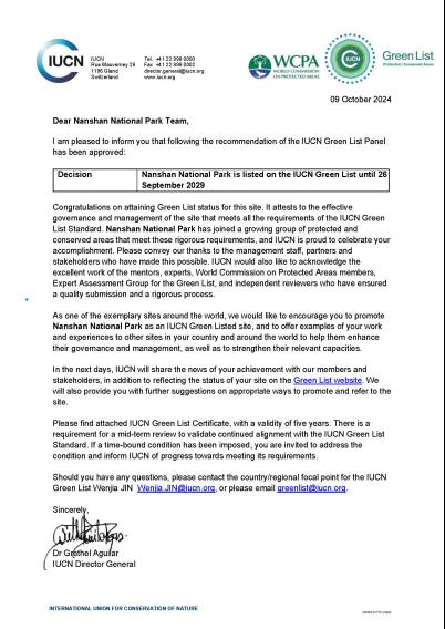 10月9日,世界自然保护联盟(IUCN)总干事格雷特阿吉拉博士签发致信,祝贺南山国家公园候选区正式入选世界自然保护联盟绿色名录(本次入选中国仅4个)。世界自然保护联盟绿色名录是一个全球性计划,是衡量保护地状况的全球标淮,聚焦“良好治理、详实设计规划、有效管理和保护成效”四类主题对自然保护地进行严格的认证,旨在增强和维持自然保护地保护成效,实现生物多样性保护和确保人与自然的可持续发展。本次成功入选展示了南山国家公园候选区在生物多样性保护和管理方面的卓越表现,全面提升南山国家公园候选区国内外影响力,进一步拓宽南山国家公园候选区国际合作交流渠道。