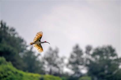 飞翔中的朱鹮 供图 崀山风景名胜区管理局