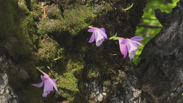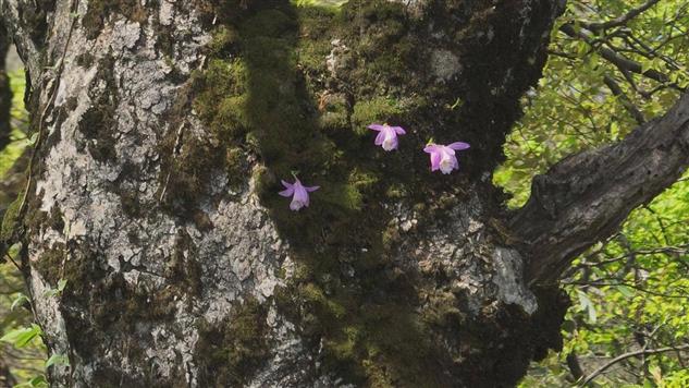 此次发现的独蒜兰生长在金童山片区古树的苔藓之上,3株独蒜兰正值花期,花朵呈紫粉色,形态优雅,迎风摇曳。还有几株独蒜兰尚处于幼苗状态,不见花苞,却蕴含着蓬勃的生命。工作人员通过现场观察植株形态特征,并结合相关资料进行比对鉴定,确认其为独蒜兰。